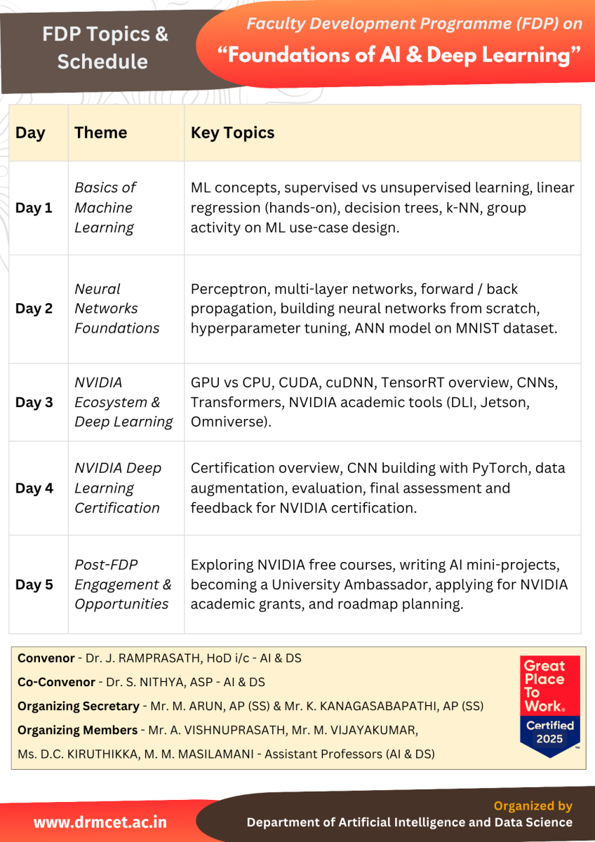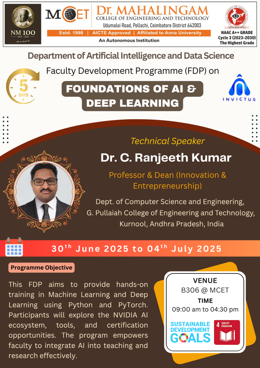 The Department of Artificial Intelligence and Data Science successfully organized a five-day Faculty Development Programme (FDP) titled “Foundations of AI & Deep Learning” from 30th June to 4th July 2025. The program provided intensive hands-on training in Machine Learning and Deep Learning using Python and PyTorch, with a special focus on the NVIDIA AI ecosystem. Key topics included neural network foundations, CNNs, Transformers, and NVIDIA's academic tools such as DLI and Jetson. Faculty participants also explored certification opportunities and future engagement plans like becoming University Ambassadors and applying for academic grants. The FDP aimed to empower educators to effectively integrate AI into their teaching and research.