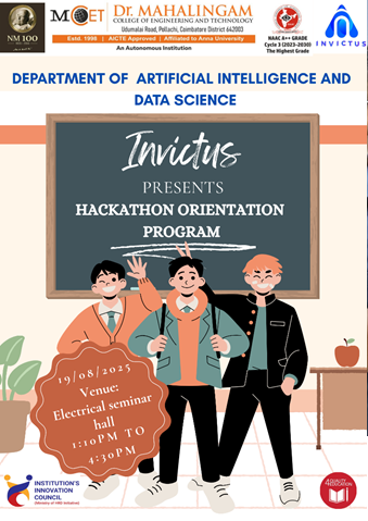 The Department of Artificial Intelligence and Data Science conducted a Hackathon Orientation on August 19, 2025, at the Electrical Seminar Hall, with 127 students participating. The session introduced students to hackathon basics, team building, and project planning, helping them prepare for events like the Smart India Hackathon.
