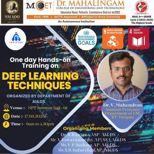 Department of AI & DS organized a One-Day Hands-on Training on Deep Learning Techniques on March 17, 2025, from 9:00 AM to 4:30 PM at NPT Seminar Hall - 01. The session will be led by Dr. V. Mahendran, Assistant Professor, Department of CSE, IIT Tirupati. This workshop aims to provide practical exposure to deep learning methodologies and their applications.
