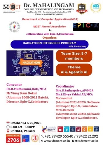 The Department of Computer Applications (MCA) and the MCET Alumni Association, in collaboration with Epic-X, Coimbatore, successfully organized the Hackathon Internship Program on October 24 & 25, 2025, at Dr. MCET, Pollachi.