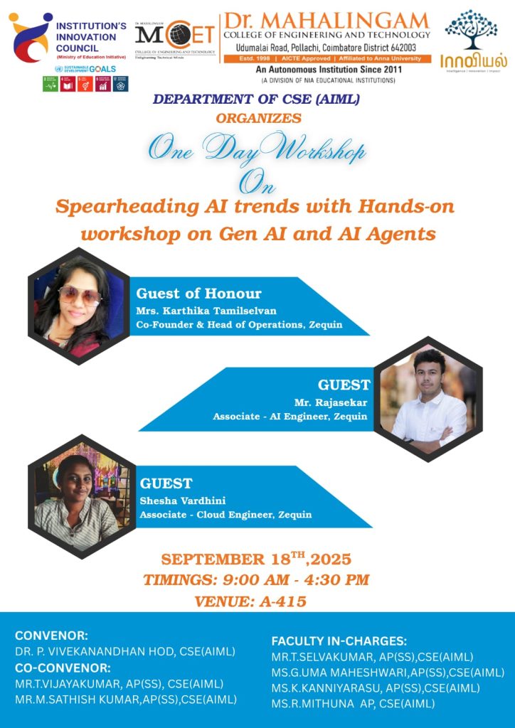 The Department of CSE (AIML) organized a one-day workshop on “Spearheading AI Trends with Hands-on Workshop on Gen AI and AI Agents” on September 18, 2025. The session featured Mrs. Karthika Tamileselvan, Co-Founder & Head of Operations, Zequin, as the Guest of Honour, along with expert guests Mr. Rajasekar (Associate - AI Engineer, Zequin) and Ms. Shesha Vardhini (Associate - Cloud Engineer, Zequin). The workshop provided students with practical insights into the latest advancements in Generative AI and AI Agents, bridging theory with real-world applications.