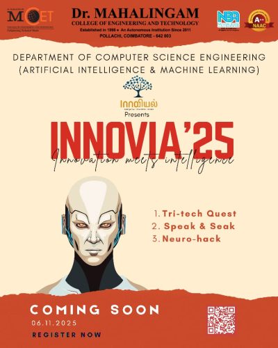 INNOVIA’25 is a department-level technical symposium that aims to bring together young innovators, coders, and thinkers in the field of Artificial Intelligence and Machine Learning. The event focuses on fostering creativity, problem-solving, and innovation through a series of engaging technical competitions and activities.