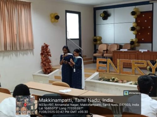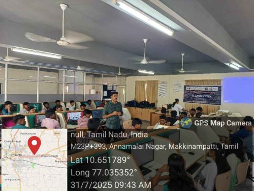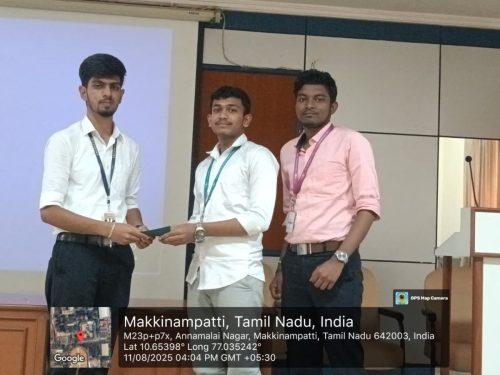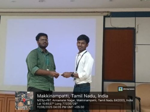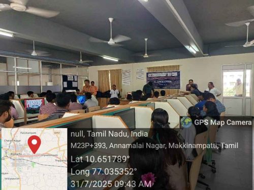 A Technical Quiz on Cybersecurity was successfully conducted on 11th August 2025. The event aimed to create cybersecurity awareness among students. The session was handled by Mr. M. Nadeesh, AP(SS)/CSE(CYS), and Mrs. E. Gayathiri. Prizes were awarded to the winning students.