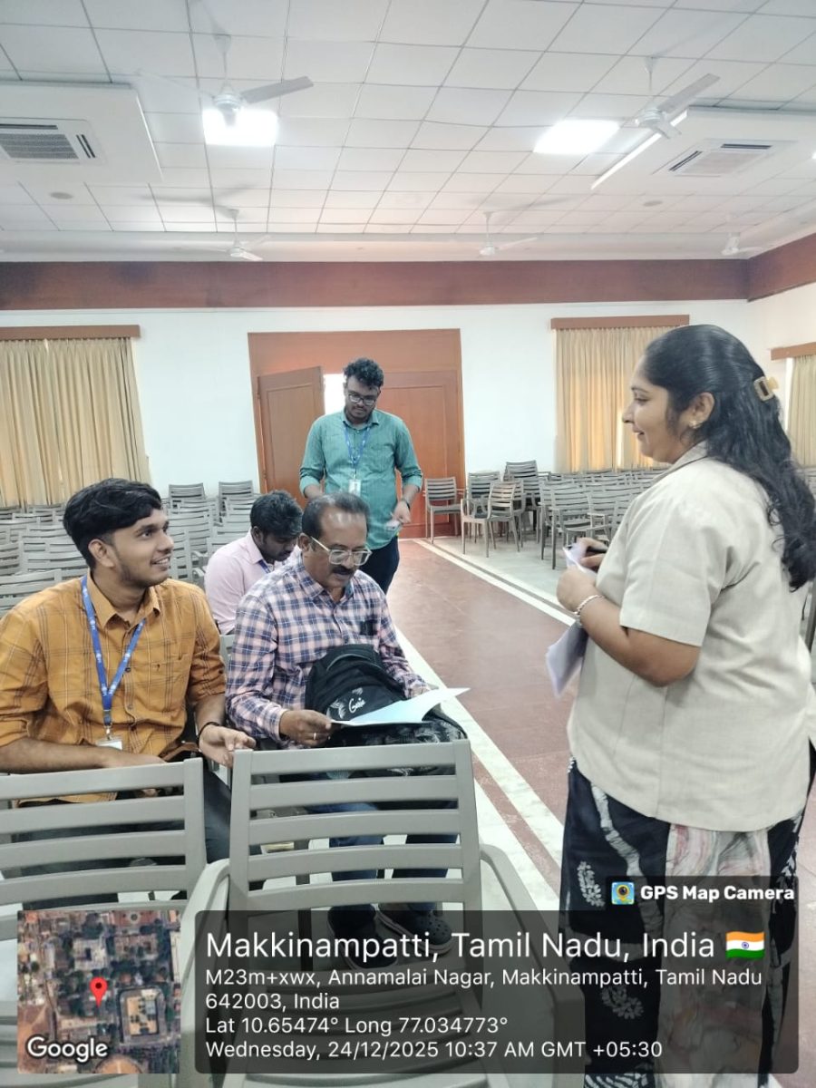 The Department of Computer Science and Engineering organized a Knowledge Sharing Session on “23CSE029—Full Stack Development" from October 23,2025 to October 25, 2025. Mr. K. Boopathi Kumar, CEO, Training Trains Software Technologies, Erode served as the resource person.