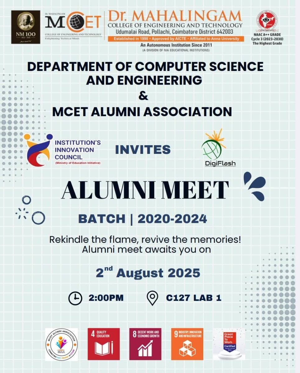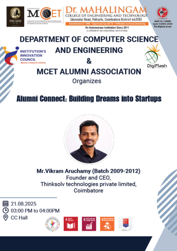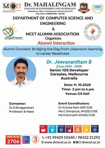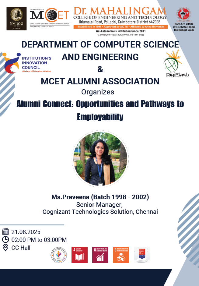 The Department of Computer Science and Engineering, in association with the MCET Alumni Association, jointly organized the Alumni Connect: Bridging the Gap from Classroom Learning to Career Readiness on 11th October 2025 at the CS Hall.