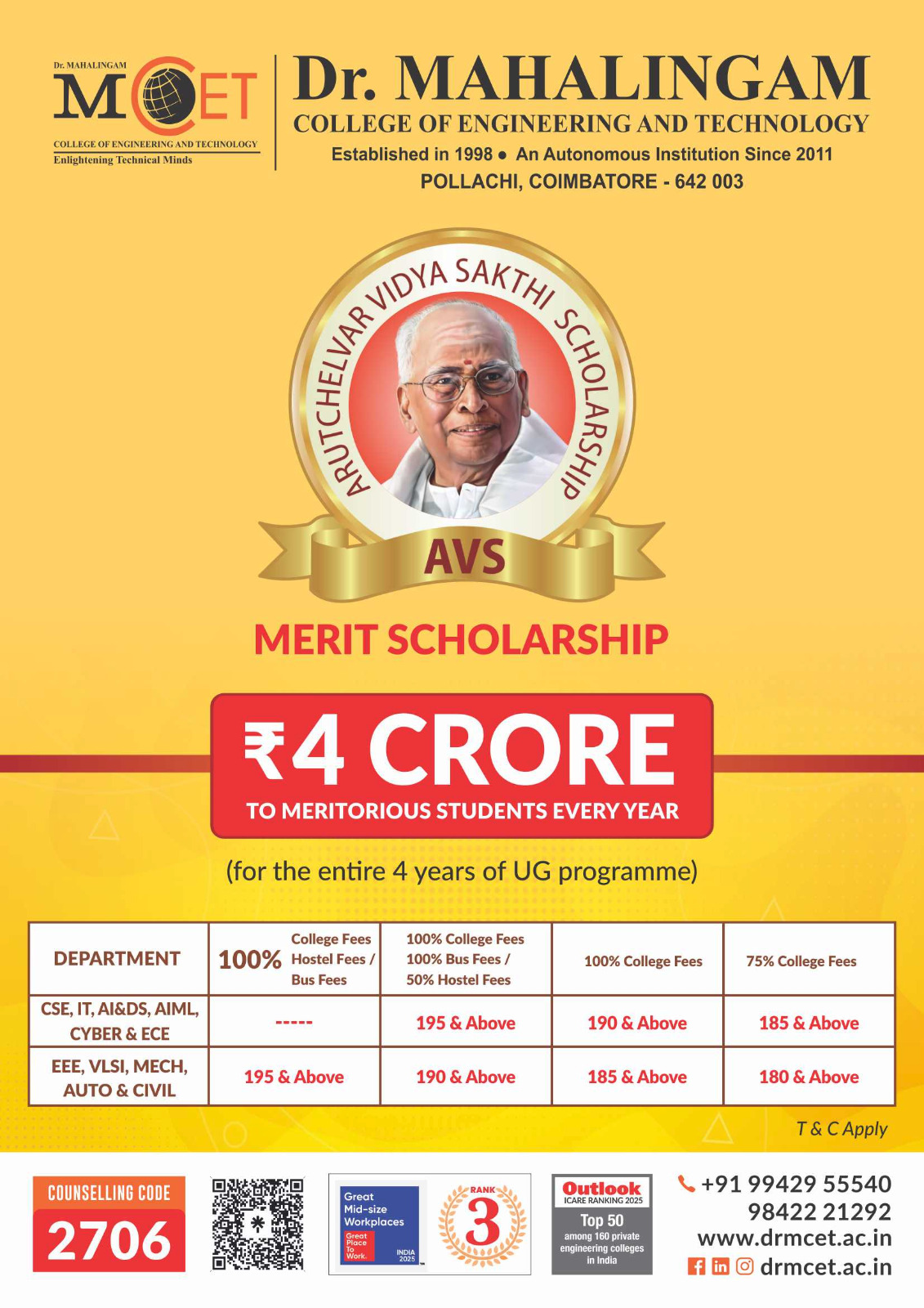 For more information about the AVS scholarship, students can contact the MCET admissions office.