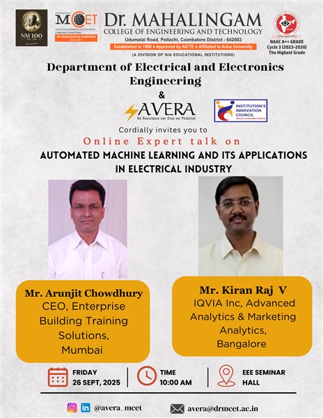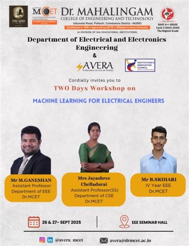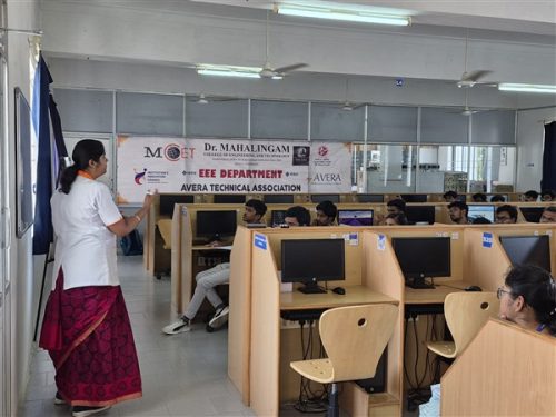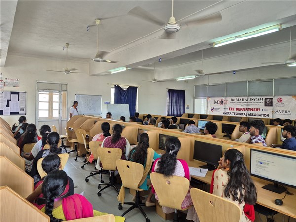 The Department of EEE in association with AVERA organized a one-day workshop on "Modelling and Simulation of Electrical Systems using MATLAB/SIMULINK." 04.09.2025 at NPT Hall No. 12. Dr. M. Kaliamoorthy, Professor/EEE, & Dr.B.Vinoth Kumar , Professor/EEE, Dr.MCET provided hands-on experience on MATLAB/SIMULINK on the aspect of making young engineers model and simulate the electrical system using MATLAB.