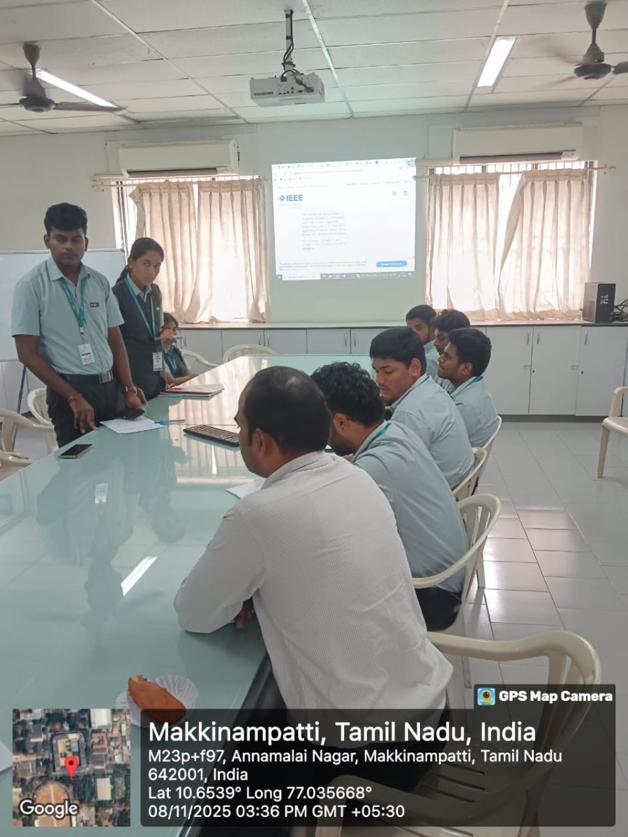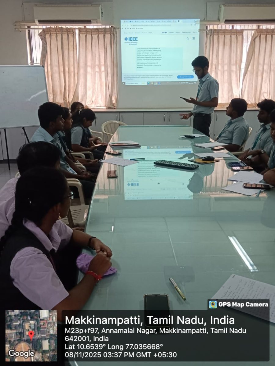 The Department of Electrical and Electronics Engineering, in association with the IEEE student chapter, organized a session on “Exploring IEEE.org Your Professional Portal to Global Innovation” on 08.11.2025 (03:00 PM) at the EEE Department Conference Hall. The discussion on the overview of IEEE.org features and membership benefits (IEEE.org, IEEE Xplore, standards, conferences, and professional development) happened. Insisted on promoting IEEE membership, student branches, and volunteering as career development tools. Addressed to improve participant confidence in using IEEE resources. Several attendees expressed intent to refer IEEE and participate in student branch activities.