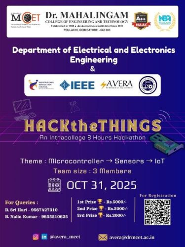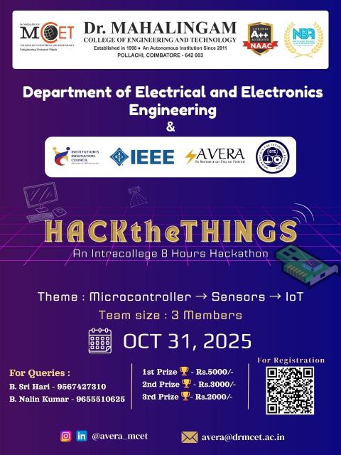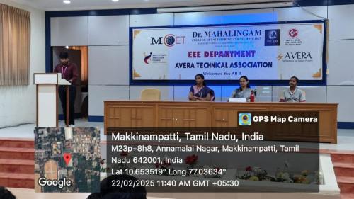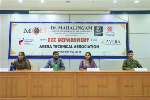 The AVERA Technical Association of the Department of Electrical and Electronics Engineering will conduct its event on 30th April 2025. The Guest of Honor will be Ms. B. Kayalvizhi, Assistant Director, Development and Facilitation Office, Ministry of MSME, Government of India, Coimbatore.