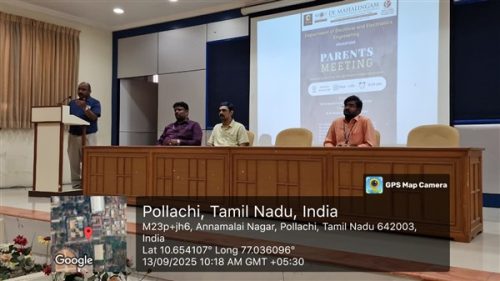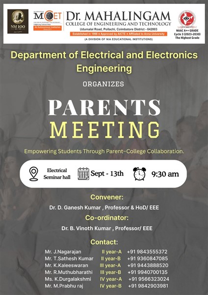 The Department of Electrical and Electronics Engineering organized a Parent-Teacher Meeting on 13.09.2025 (09:30 AM) at the EEE seminar for II, III, and IV year EEE students. Over 125 students' parents took part in this meeting and got to know about their ward and provided their valuable feedback. The details of training, internship, and placement were deeply discussed along with their academic performance.