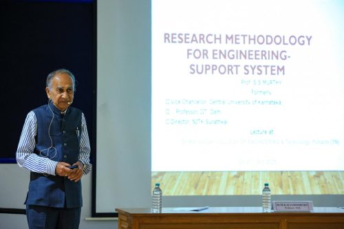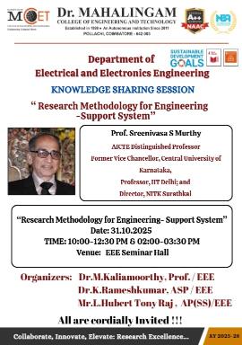 The Department of Electrical and Electronics Engineering, organized a Knowledge Sharing Session on "Research Methodology for Engineering - Support System" on 31.10.2025 at the EEE seminar hall. Dr. S S Murthy AICTE Distinguished Professor, former Vice Chancellor, Central University of Karnataka, Professor IIT Delhi and Director NIT Surathkal provided his valuable insights on recent research in engineering, how to set research goals, the procedure to undertake good research, paper and thesis preparation strategy, national funding agencies, and advances in technology towards research.
