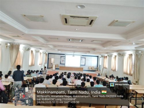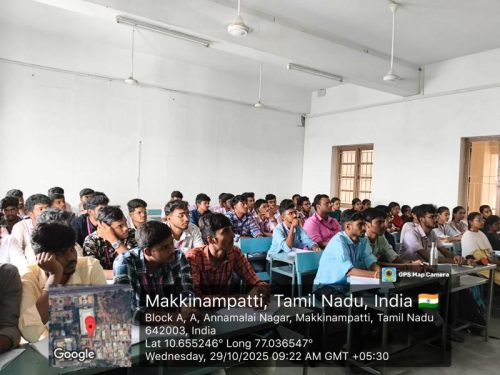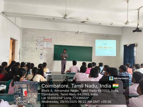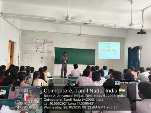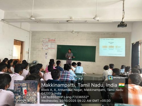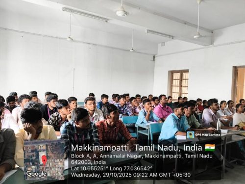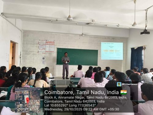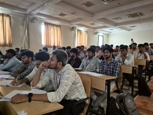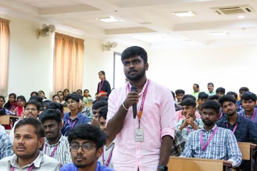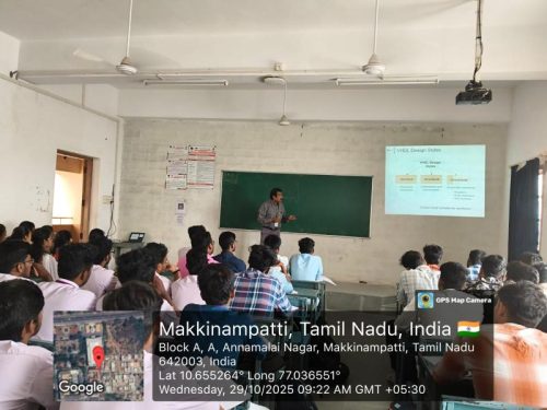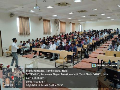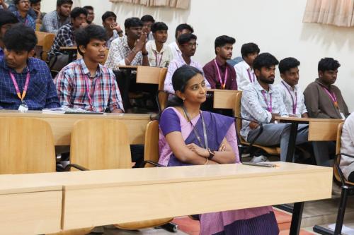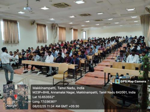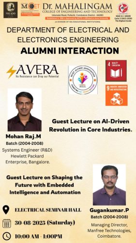 Prestigious alumnus Mohan Raj M (2004-2008 Batch), Systems Engineer (R&D), Hewlett Packard Enterprise, Bangalore, provided his ideas on the "AI-driven revolution in core industries," and Gugankumar P (2004-2008 Batch), Managing Director, Manfree Technologies, Coimbatore, gave a lecture on "Shaping the future with embedded intelligence and automation" to EEE department students on 30.08.2025 (10:00 AM).