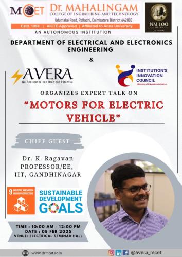 Expert Talk on “ Motor for Electric Vehicle” on 08.02.2025 (10:00 AM – 12:00 PM), Venue Electrical Seminar Hall, MCET Campus, Pollachi.