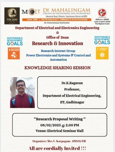 Knowledge Sharing session on “Research Proposal Writing” on 08.02.2025 (02:00 PM – 04:30 PM), Venue Electrical Seminar Hall, MCET Campus, Pollachi.