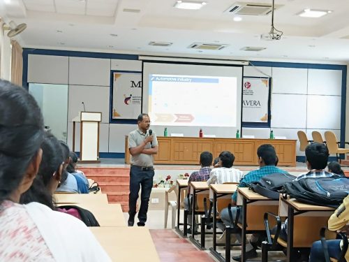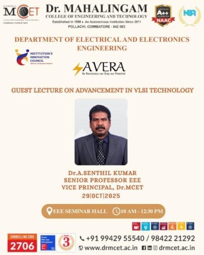 The Department of Electrical and Electronics Engineering, in association with AVERA and IIC, organized a Guest Lecture on "Advancement in VLSI Technology" on 29.10.2025 at the EEE seminar hall. Dr. A. Senthil Kumar, Vice Principal and Senior Professor at DrMCET, shared his expertise and knowledge in VLSI technology advancement. The EEE department students benefited from his insights and gained extensive knowledge about VLSI technology.
