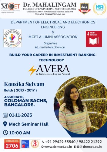 The Department of Electrical and Electronics Engineering, together with MCET Alumni Association, organized an Alumni Interaction on "Build Your Career in Investment Banking Technology" on 01.11.2025 at the Mechanical Seminar Hall. Kousika Selvam, Associate, Goldman Sachs, Bangalore, of batch (2013 - 2017) had an interaction with students with valuable insights into career opportunities in the field of investment banking technology, a fast-growing and dynamic sector that blends finance with advanced technology.