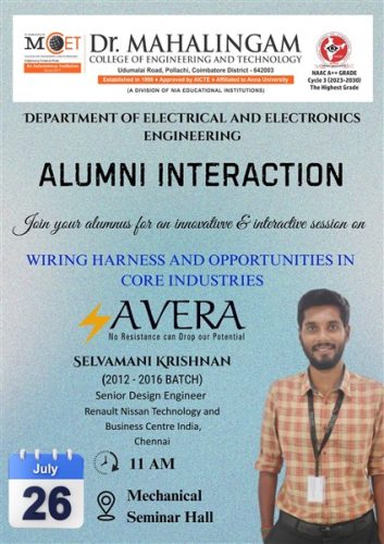 Prestigious Alumnus Mr. Selvamani Krishnan (2012-2016 Batch), Senior Design Engineer, Renault Nissan Technology and Business Centre, Chennai was on interaction with our EEE department students on 26.07.2025 (11:00 AM).