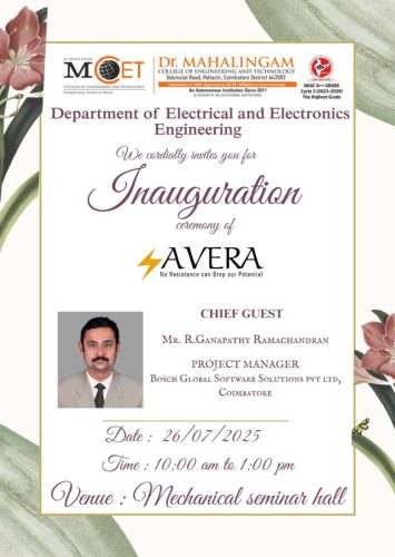 The Inauguration of AVERA Technical Association of the Department of Electrical and Electronics Engineering was conducted on 26th July 2025. The Guest of Honor was Mr.R.Ganapathy Ramachandran, Project Manager, BOSCH Global Software Solutions Pvt Ltd, Coimbatore.