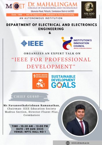 The Department of Electrical and Electronics Engineering in association with IEEE student branch and IIC organized an Expert Talk on "IEEE FOR PROFESSIONAL DEVELOPMENT." on 09.08.2025 at 10.30 AM. The Chief Guest is Mr. Navaneethakrishnan Ramanathan, Chairman, IEEE Education Society, Madras Section, Coimbatore.