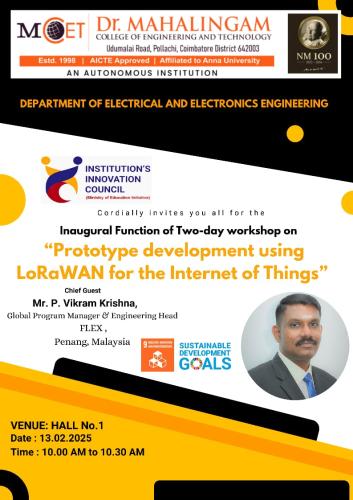 Two – day workshop on “ Prototype development using LoRaWAN for the Internet of Things” on 13.02.2025 and 14.02.2025, Venue Hall no 1 NPT, MCET Campus, Pollachi.