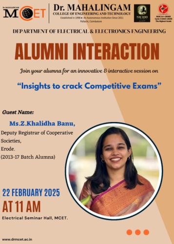 Alumni Interaction on “Insights to crack competitive exams” on 22.02.2025, Venue Electrical Seminar Hall, MCET Campus, Pollachi.