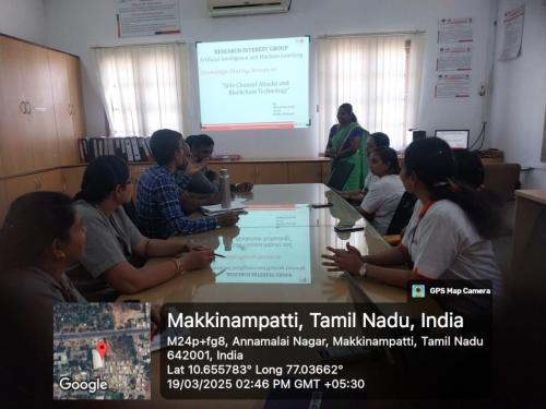 Department of Information Technology and The Artificial Intelligence and Machine Learning - Research Interest Group (AI & ML - RIG) organized a Knowledge Sharing Session on "Side Channel Attacks and Blockchain Technology" on March 19, 2025. Ms. S. Selvanayaki, Assistant Professor, Department of Information Technology, served as the resource person.