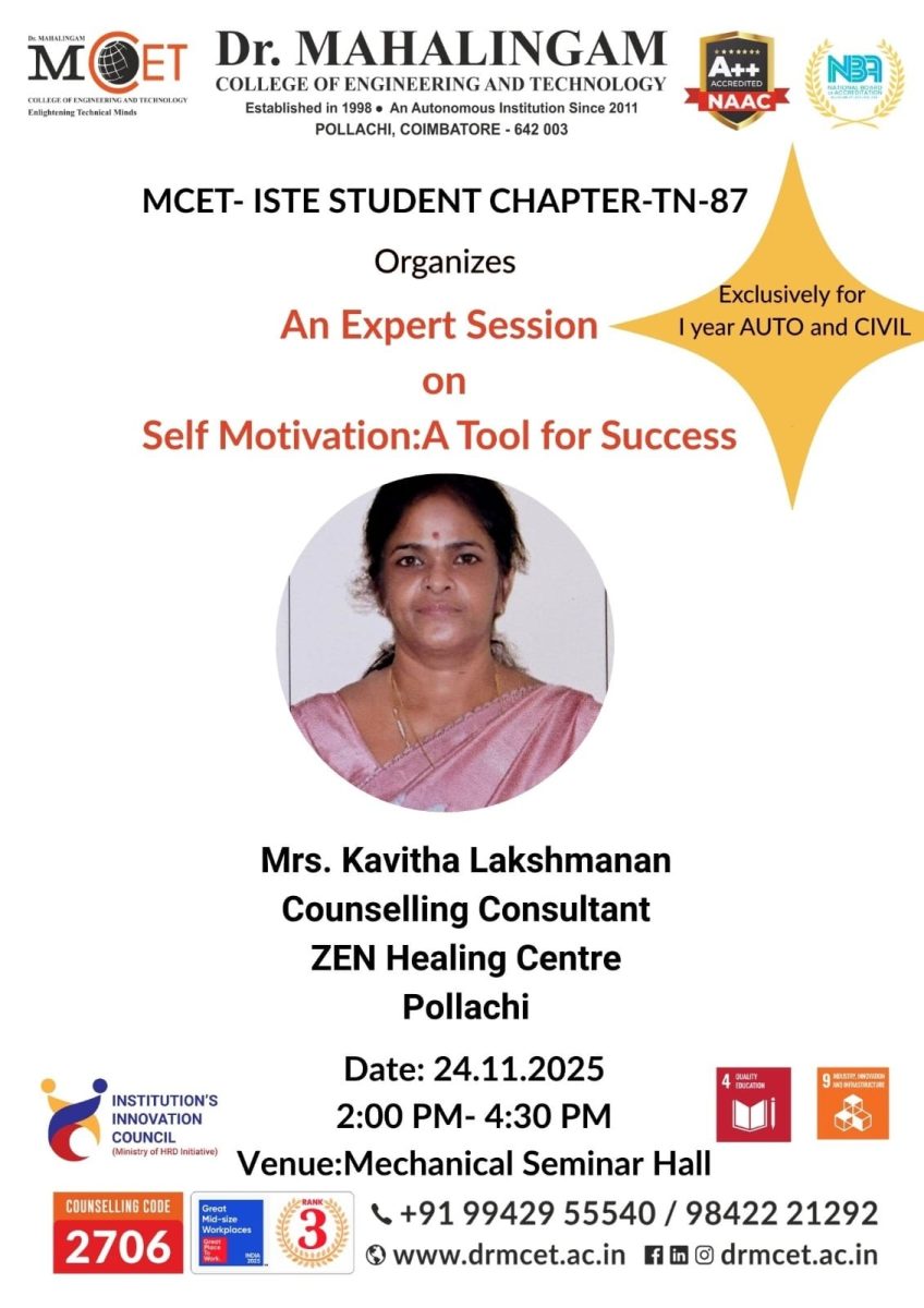 The Expert Session on Self-Motivation: A Tool for Success was conducted on 24-11-2025 from 2:00 PM to 4:00 PM at the Mechanical Seminar Hall, featuring Mrs. Kavitha Lakshmanan, Counselling Consultant from the ZEN Healing Centre, as the resource person. A total of 115 participants attended the session, which focused on understanding self-motivation as a key factor for personal and professional success and encouraged students to cultivate positive habits, confidence, and goal-oriented behavior.