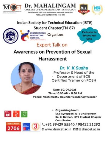 An awareness program on the prevention of sexual harassment will be held on 30th September 2025 from 10:00 AM to 12:00 at the Nachimuthu Gounder Centenary Center in Pollachi. The session aims to educate and sensitize participants about the importance of creating a safe and respectful environment, free from harassment. The expert speaker for the event is Dr. V.K. Sudha, Professor in the Department of Electronics and Communication Engineering at Dr. Mahalingam College of Engineering and Technology, Pollachi. All students, faculty, and staff are encouraged to attend and actively engage in this important initiative.