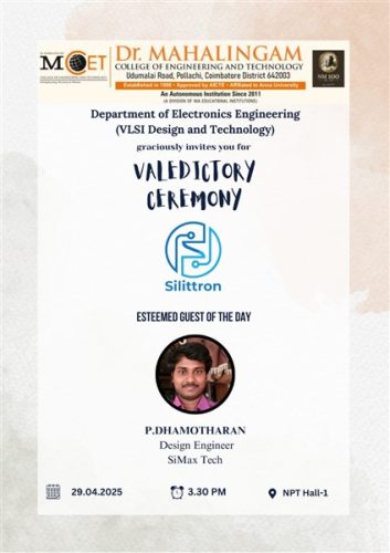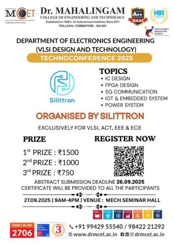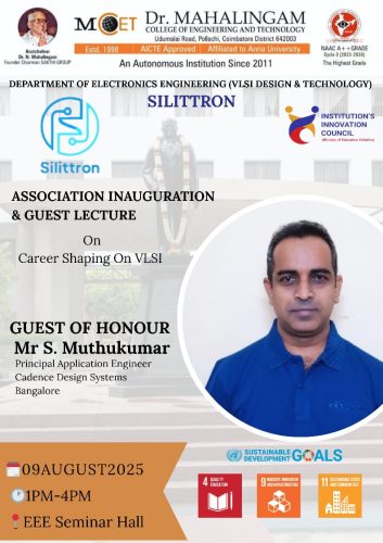 The Department of Electronics Engineering (VLSI Design and Technology), Dr. Mahalingam College of Engineering and Technology, Pollachi, proudly inaugurated its Department Association SILITTRON for the Academic Year 2025–2026 on 9th August 2025 (Saturday) at the EEE Seminar Hall from 1:00 pm to 4:00 pm.